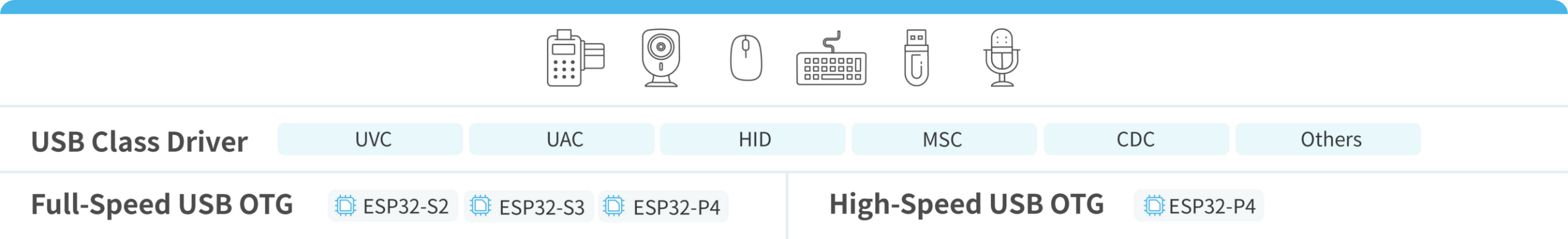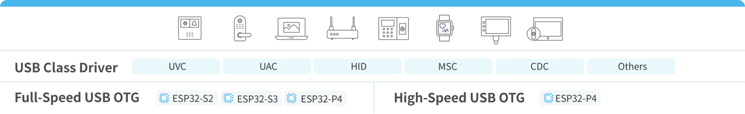 USB (Universal Serial Bus) は、ホストと外部デバイスを接続するための汎用インターフェース規格です。Espressif の USB ソリューションは、ユーザーにとってシンプルかつ迅速なデバイス接続とデータ転送手段を提供します。 Espressif の SoC (ESP32-S、ESP32-C、ESP32-P シリーズ ) は、標準ペリフェラルの 1 つとして USB を搭載しており、USB 2.0 OTG (On-The-Go) や USB-Serial-JTAG インターフェースを通じて、ホスト (Host) およびデバイス (Device) の両方に対応可能です。 これにより、豊富な USB ホストソリューションおよび USB デバイスソリューションを提供可能です。Espressif SoC 搭載機器を USB ホストモードに設定すれば、各種汎用 USB デバイスと接続でき、電子ドアビューア、4G IoT ゲートウェイ、勤怠管理端末など、多様なアプリケーションに対応します。 また、USB デバイスモードに設定すれば、キーボード、マウス、USB メモリ、マイクなどの周辺機器として PC やモバイル端末に直接接続することができます。
