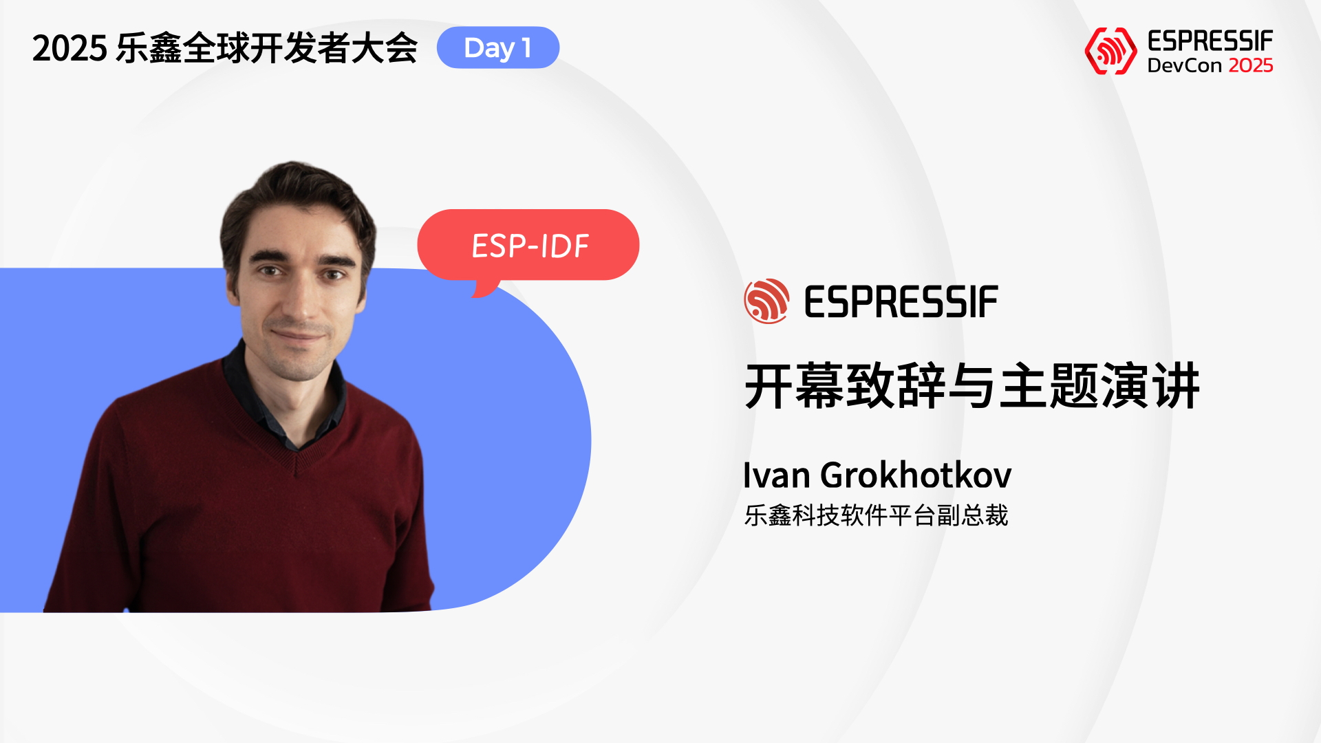 大会首日,乐鑫软件平台副总裁 Ivan Grokhotkov 发表开幕致辞,从最新产品进展、平台演进路线到 AI 能力布局,对乐鑫整体技术战略进行了系统梳理,并分享了人工智能在未来几年将如何重塑 ESP 平台及相关生态。这一演讲为整场大会奠定了清晰的技术方向与思考框架。