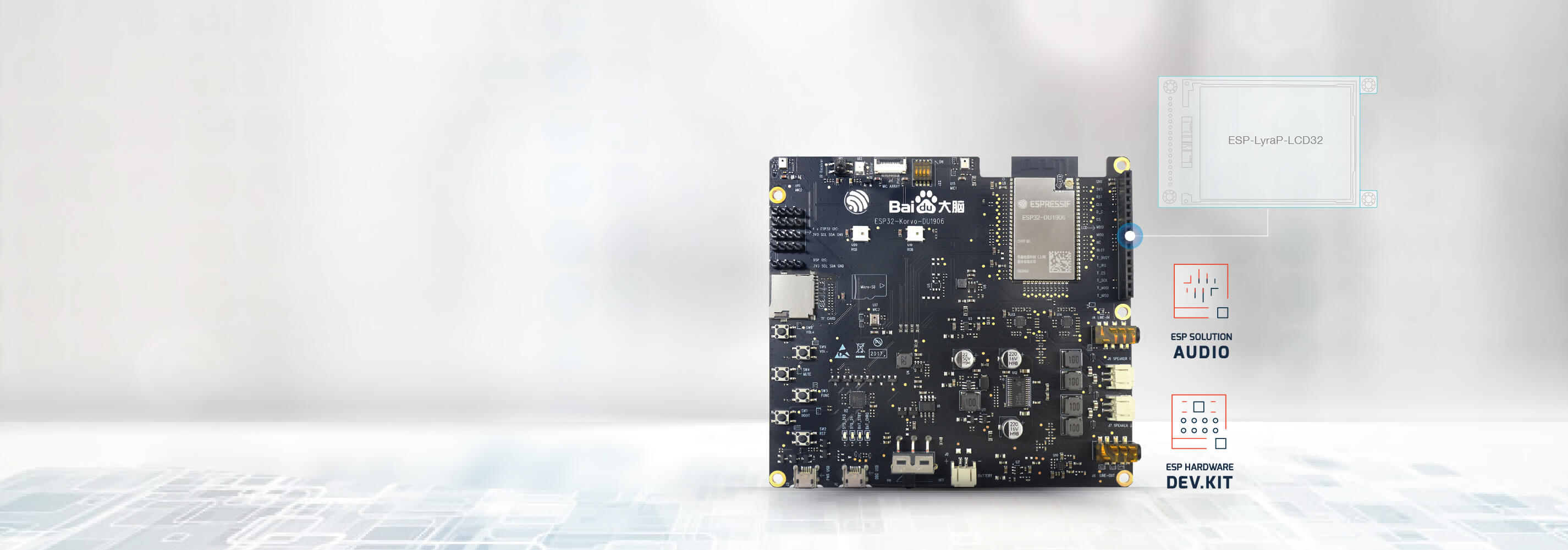 ESP32-Korvo-DU1906 搭载百度鸿鹄语音芯片,采用 2 mic 设计,能够实现 5 米准确拾音,3 米内 85dB 播放打断唤醒功能,以及低于一天一次的误报。它搭载了基于百度深度学习技术 Deep Peak 的高性能唤醒引擎和基于复数 CNN 的语音增强和声学建模一体化建模技术,大幅提升了语音交互体验。