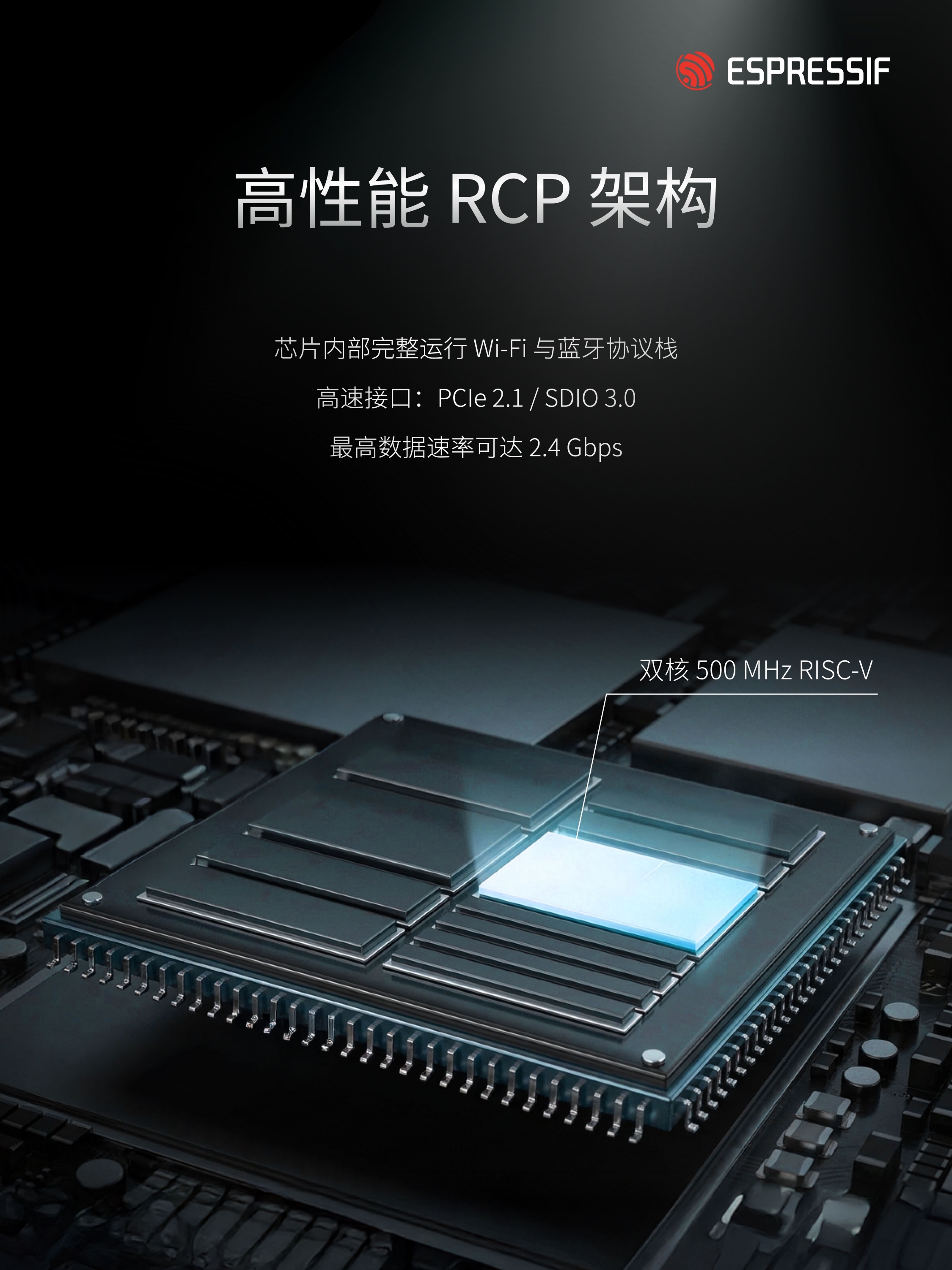 作为一款无线连接协处理器 (Radio Co-Processor, RCP),ESP32-E22 在芯片内部完整运行 Wi-Fi 与蓝牙协议栈,涵盖安全、认证、扫描、漫游以及蓝牙主机功能等关键模块。该架构使系统设计者能够通过 PCIe 2.1、SDIO 3.0 等高速接口,根据需求将 ESP32-E22 与乐鑫自有 SoC 或第三方主处理器灵活配合。