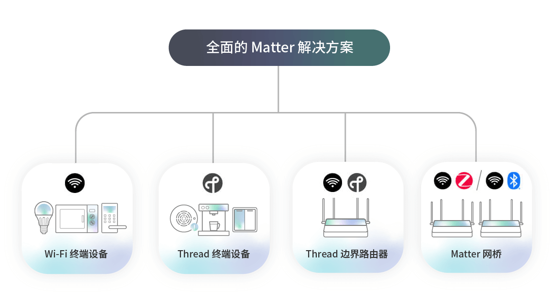 作为 CSA 的活跃成员,乐鑫是 Matter 协议开发的首批参与者和 Matter 发展的积极推动者。我们通过将无线通信 SoC、软件和完整的解决方案相组合,使客户能够轻松地构建各类支持 Matter 的智能家居互联设备。乐鑫提供全面的 Matter 解决方案,包括 Matter over Wi-Fi 终端设备、Matter over Thread 终端设备、Thread 边界路由器和 Matter 网关等参考设计。
